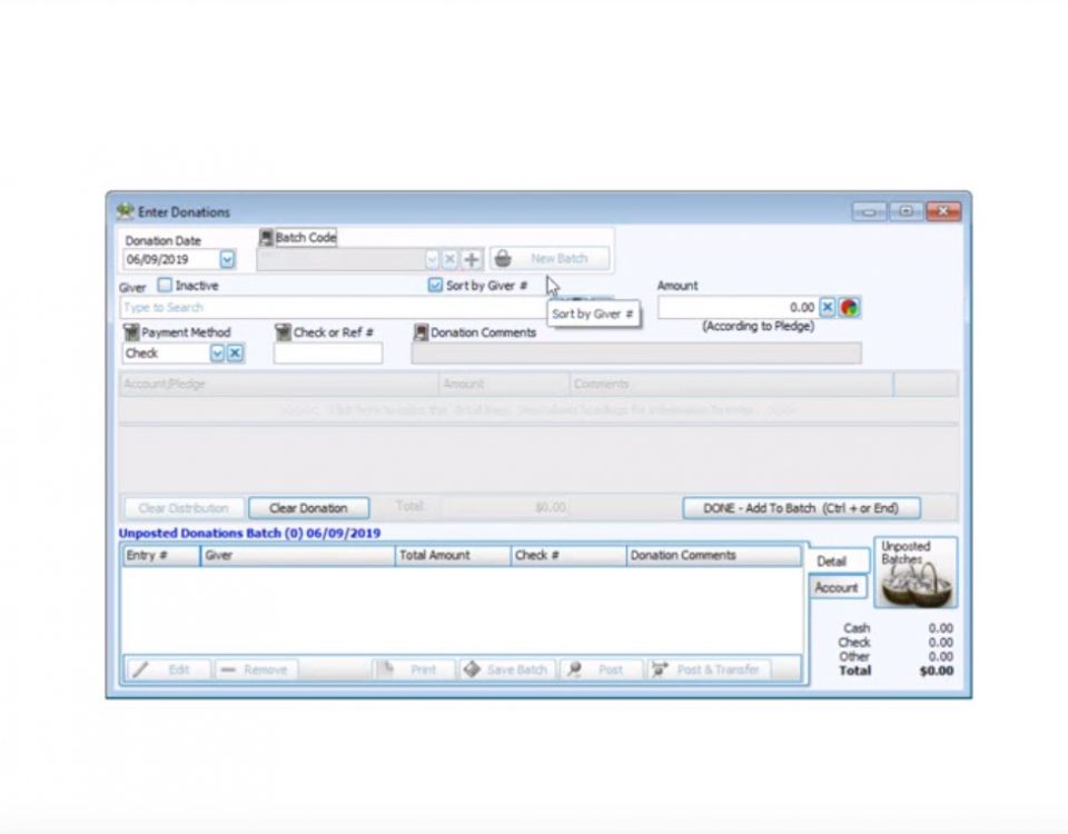 In this video, learn about entering donations, batch codes, account order, edit an item, delete an entry, print batch report, post batch, and unposted batches. Presented on 08/08/2024.