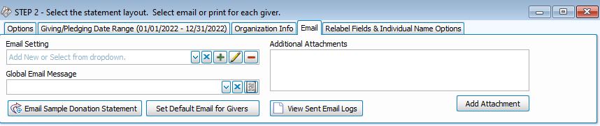 To access from the Step 2 - Statement Layout window, go to Reports/Exports > Donation Statements > Email Tab