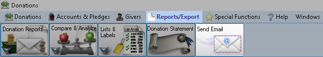 To access from the Donations Button Bar, go to Reports/Exports > Send Email