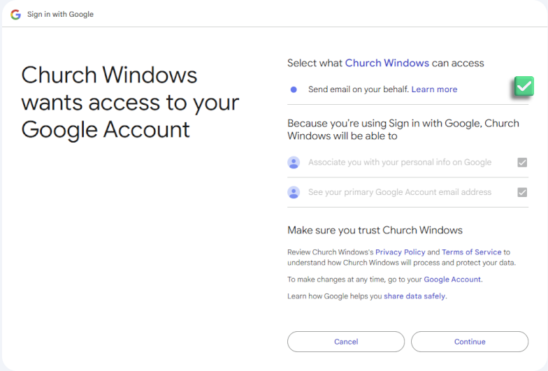 Check the box that will allow Church Windows to send email on your behalf.