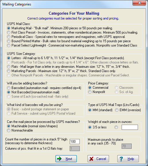 Enter your categories. For questions or clarifications on this dialog, reach out to Postage $aver. For information on mailing requirements, consult USPS.