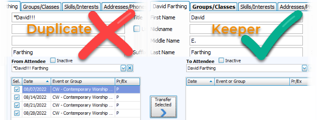 To differentiate your duplicates when you Transfer Donations and Transfer Attendance, put a * or other symbol in the records you'll eventually archive or delete.