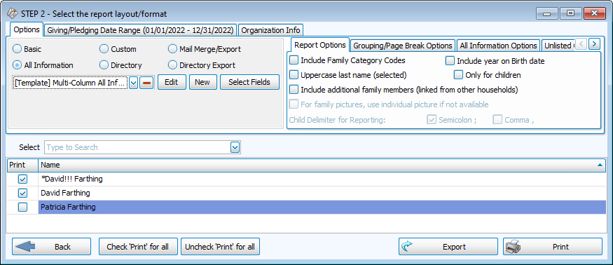 • Use Middle Initials in large databases. To avoid confusion with common names, go to Settings and check the box for 'Show Middle Name in Donations/Membership (requires restart).