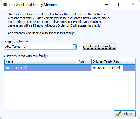 In the People drop down, search for the child to link to this family. They must be listed with a Directory/Report Order of 3 - Child with Family to appear in this list. Click
