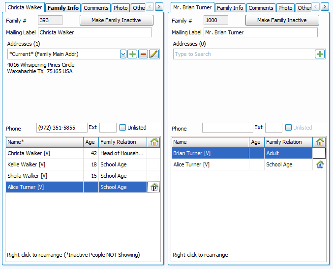 The child can now be seen included in both families but with only one individual record. The icon represents the child's Primary household while the A icon represents a child's Additional household.