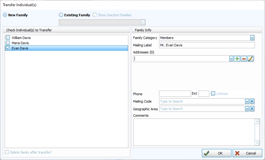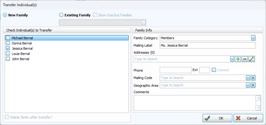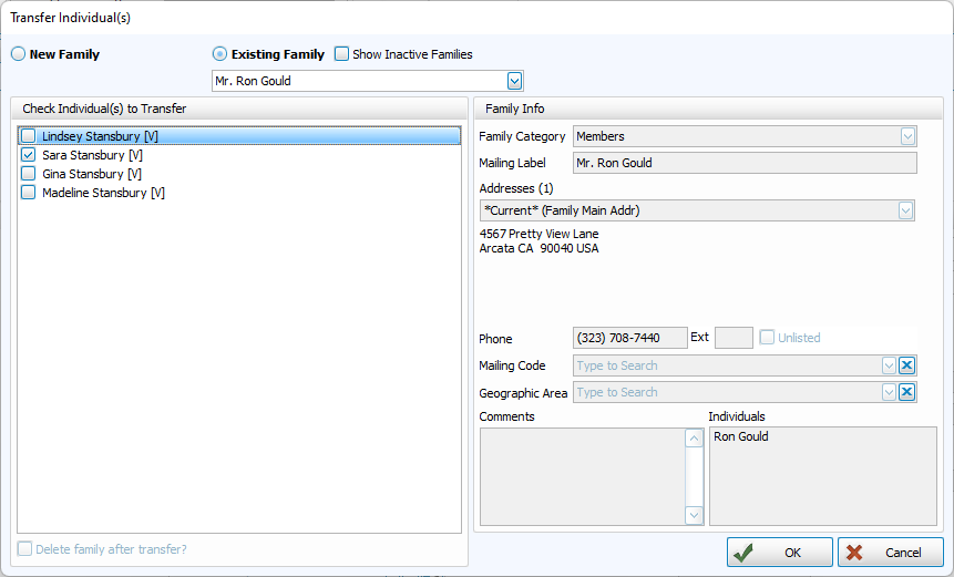 Make sure only the Individual(s) you want to transfer are checked on the left side. To look up the household this person will be transferred into, select the radio button for Existing Family.