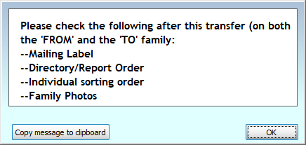 . The following message will appear with suggestions for fields to verify in both the family it is transferring to and from.