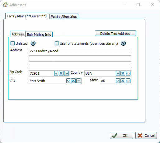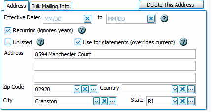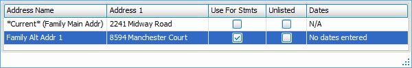 Records from Membership are made available in the Donations module, however, contact information is still edited from the Membership module. You can designate an alternate address for statements from the edit screen by checking Use for Statements. This will override the current address and will be noted in the address drop-down list.