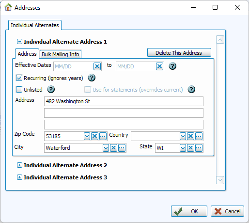 Effective dates are important for alternate addresses to list correctly. To list this as a primary address for a family or individual, enter effective dates. When producing mailing labels, the Date of Mailing field on Step 2 determines which address should be prioritized.