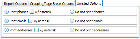 Unlisted contact information will not be included in Directory layouts. On other reports, you have the option of either printing these contact pieces, excluding unlisted information, or printing it with an asterisk.