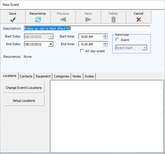 If you elect to add the follow up to scheduler, the New Event window will come up when you finish entering the visit.