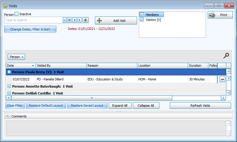 Visits are laid out in a grid. The default view groups and sorts by Person in the current year. Drag and drop column headings into the gray area above the grid to arrange and group information.