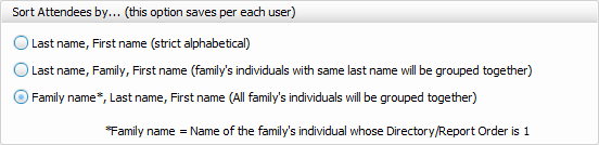 This is a user specific setting. Decide whether you'd like potential attendees to be sorted by their own last name, family name (primary's last name) then last name, or by family.