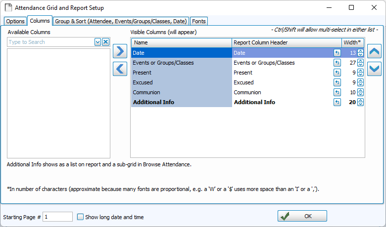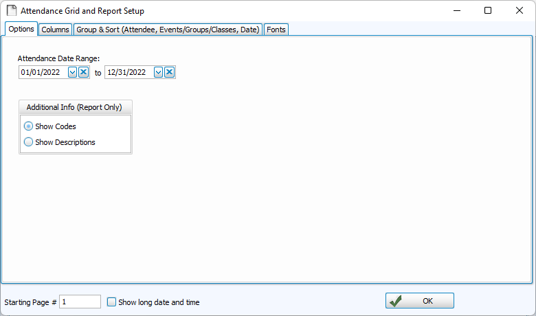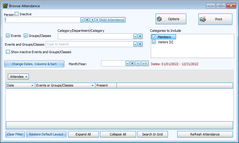 The Browse Attendance screen will default to the current calendar year. Change dates using Change Dates, Columns & Sort, or with the Month and Year Controls.