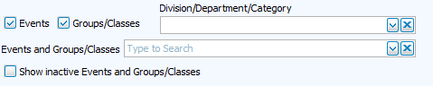Filter your options with the check boxes to include Events or Groups/Classes. Further filter Groups/Classes by selecting a Division, Department or Category. Select the Event, Group or Class from the drop down.