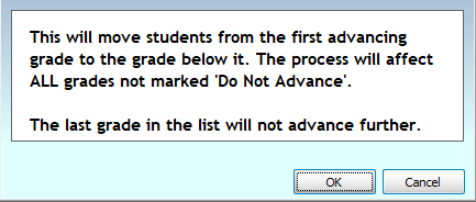 Advance grades allows you to move up every record that has a school grade listed in one process. Any exceptions that did not proceed to the next grade level, can be manually corrected.