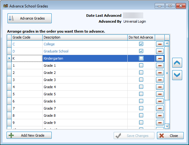 Grades will progress from the first in the list not marked as Do Not Advance. Change the order by selecting a grade and moving it with the