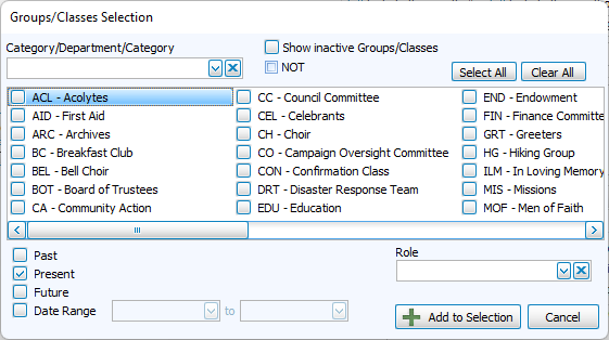 • Category/Department/Category - Filter available groups and classes, click Select All or Clear All to expedite selections.