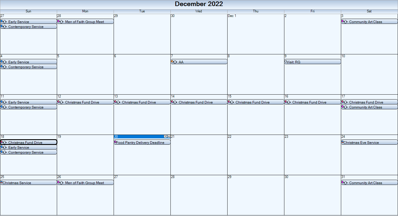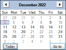 The mini-calendar in the upper right defaults to the current month. This default can be changed in Options. Today's date appears circled in red and the dates shown on the grid will appear highlighted in blue on the calendar.