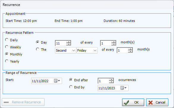Click OK to save your new recurrence information or Cancel to discard the changes you have entered.