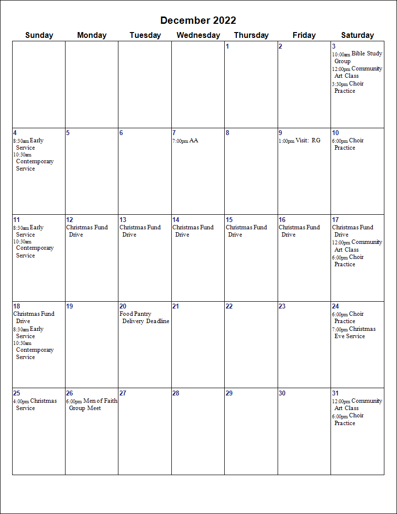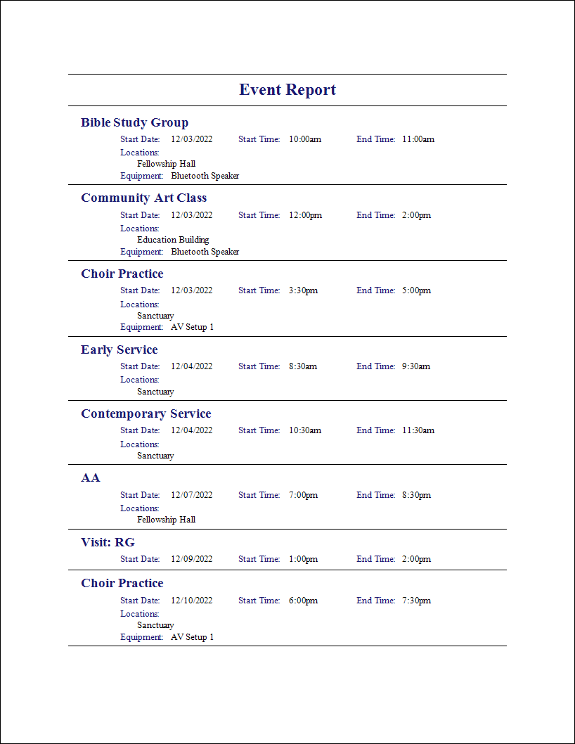 The report will allow you to print your events in a Calendar format. You can choose either a monthly calendar or a weekly calendar. The monthly calendar will show selected events for the specified month on one page. The weekly calendar will have seven columns with the events for each day reflected in the appropriate column. All-day events will appear first in either format:
