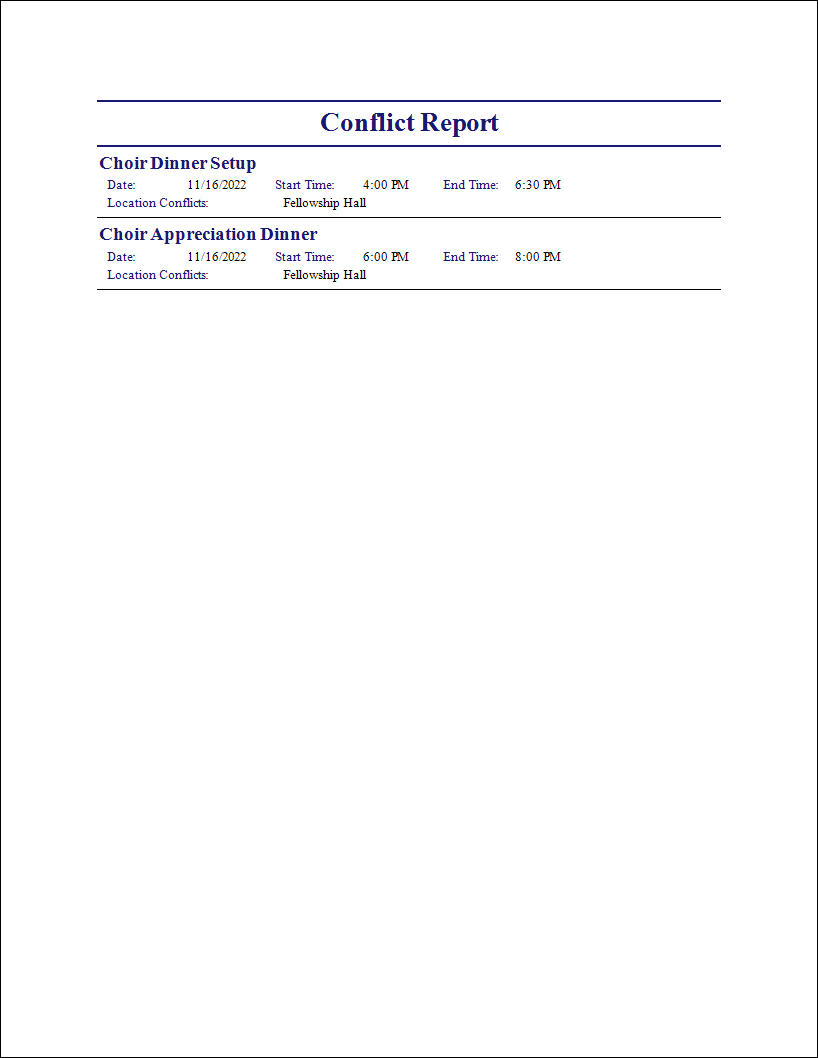 The Conflict Report will list the Conflicting Events during the date range selected.