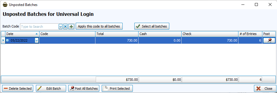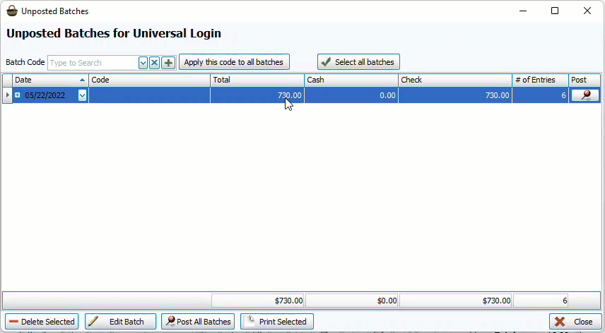 If needed, you can assign batch codes from this screen, either individually from the code column or to all unposted with