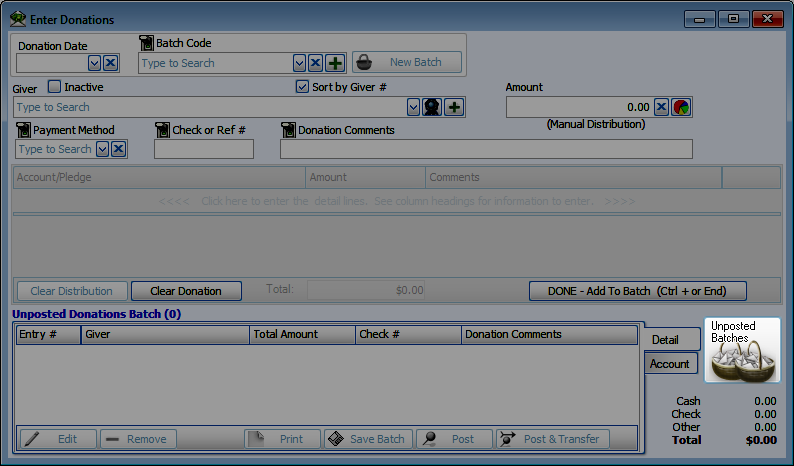 If there are Unposted Batches under the current user, the Unposted Batches screen will open with Enter Donations.