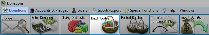 To access from the Button Bar, go to Donations > Batch Codes.