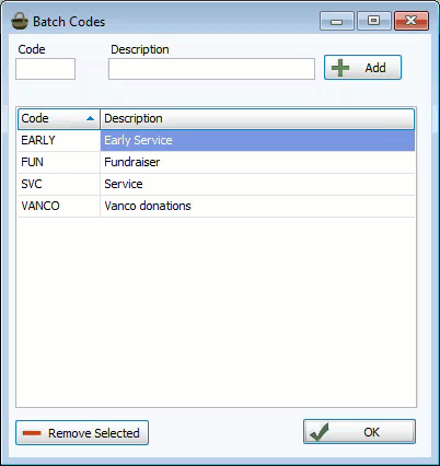 Batch codes are labels that can be assigned to groups of donations to categorize them. A batch of donations are posted together and share the same donation date.