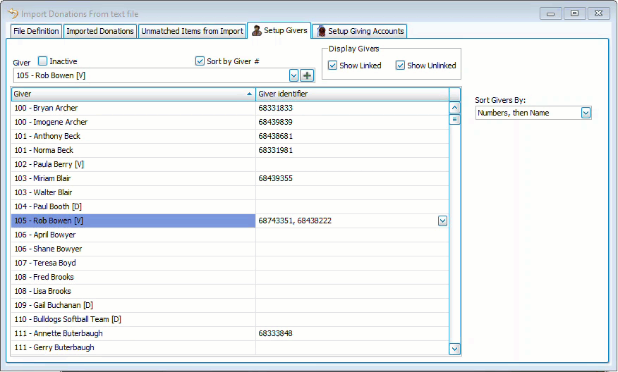 The Setup Givers tab of Import Donations allows you to assign records in Church Windows to their corresponding ID numbers from an online giving system.