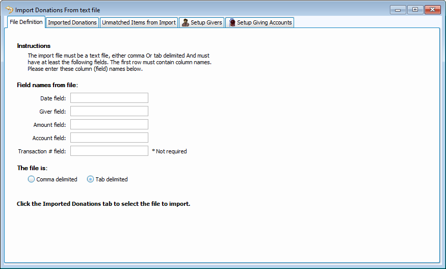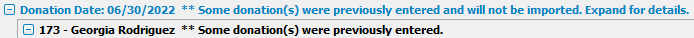 Donations that have an exact match on Giver, Date, Amount, and Account will be identified as duplicate entries and will not be imported.