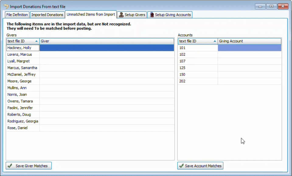 If there are new givers or accounts in the text, file they'll be included the Unmatched Items from Import tab to be matched to their corresponding giver record or giving account. Click