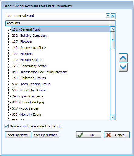 Order accounts allows you to change the order of the account dropdown displayed in Enter Donations.