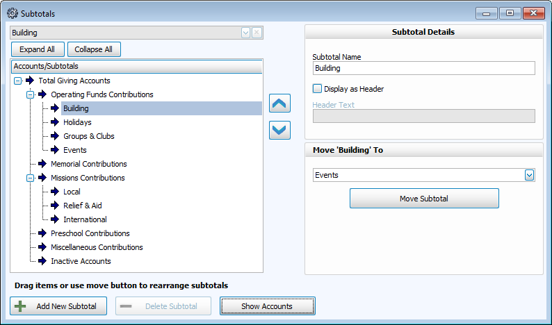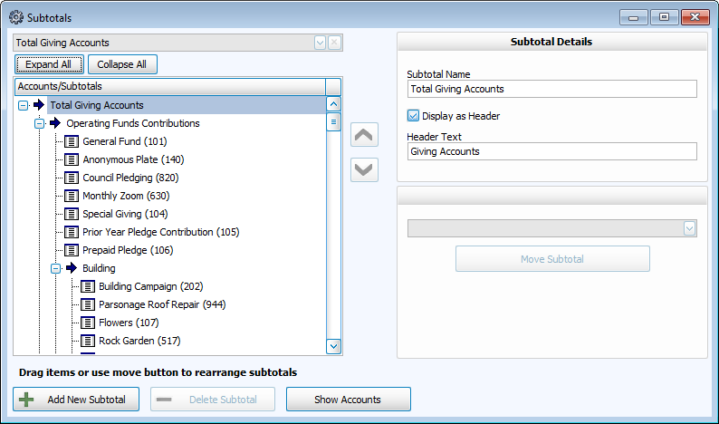 Subtotals allow you to group related accounts together to get quick subtotals of connected funds. For example, you might have a building fund, an organ fund, and a kitchen remodel fund. Using subtotals you can quickly generate reports showing the individual balances and in hierarchies of subtotals.