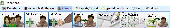 The Givers menu houses functions related to managing individual donors and assignments. If your church uses Giver or Envelope numbers, those functions will be found here.