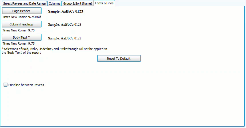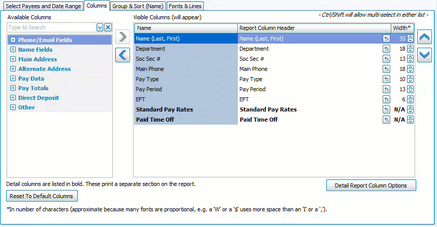 Determine the width of a column by character count. Change or abbreviate how a column is titled by editing Report Column Header.