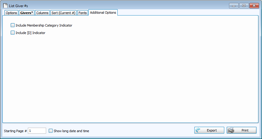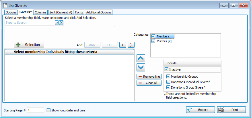 • The Giver tab allows you to use Membership criteria, Family Category, or Record type to filter givers.