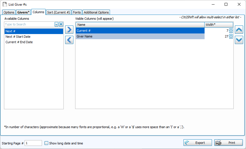 • Add or reduce columns on the Options tab. Determine columns and widths on the Columns tab.
