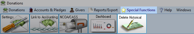 Delete Historical Data is an ability enabled on the Donations Security screen. This allows for the deletion of donations data older than 7 years.