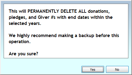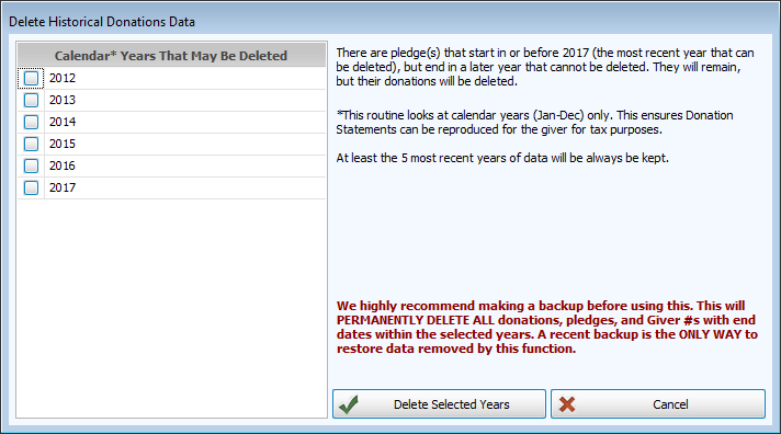Deleting historical data will erase all of the Donations data for the selected year. This would include all Donations entries and giving history for those years. Do not use this function if you would like to be able to run reports for lifetime giving.