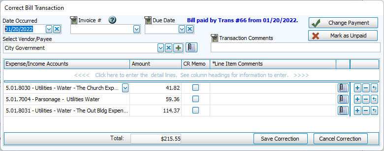 When correcting an Invoice Accounts Receivable transaction (ARIN) or an entered Enter Bills transaction (BILL) that has already been paid, you will be given an option to mark it as unpaid, change the payment or the collection information on the transaction you are correcting. If the a bill has not been paid you will the option to mark it as paid and then match it with its payment transaction.