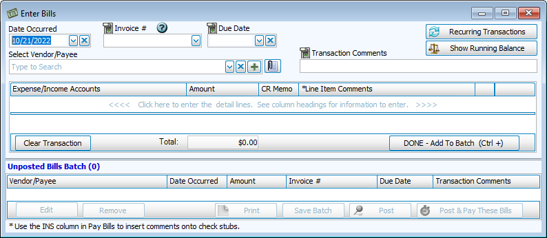 • Click Post & Pay These Bills to open the Pay Bills screen after posting.