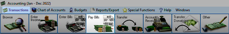 To access from the Button Bar, go to Transactions > Pay Bills