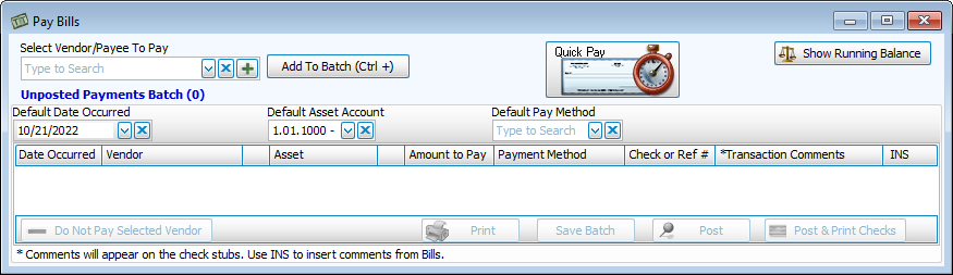 Use the Pay Bills screen to process bill payments, such as those recorded in Enter Bills. Add payments to the Unposted Payments Batch to then Print, Post, or Post & Print Checks.