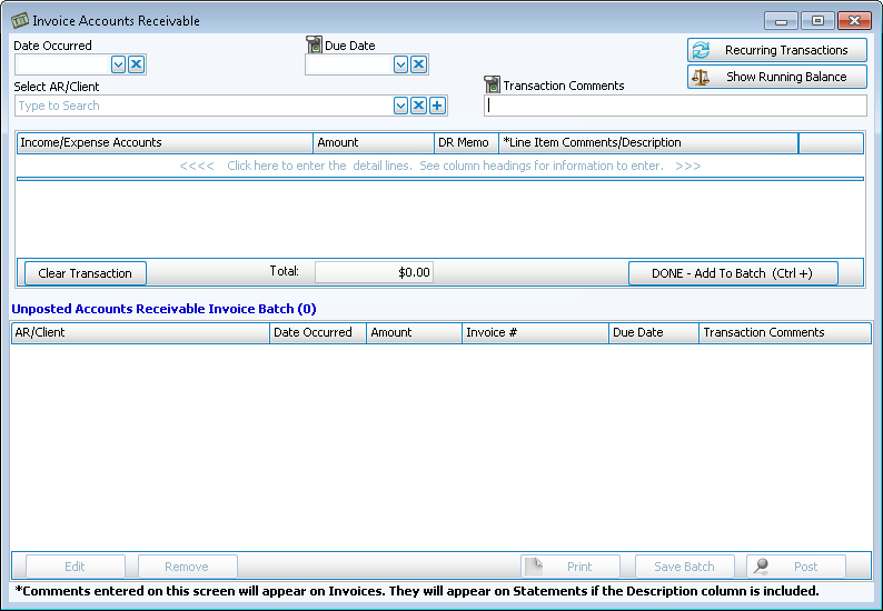 Repeat these steps for every transaction until all your batch items have accumulated in the Unposted Accounts Receivable Invoice Batch list.