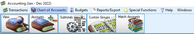 The options in this toolbar are: View Accounts, Add and Remove Accounts, Subtotals, Custom Account Groups, Match Accounts