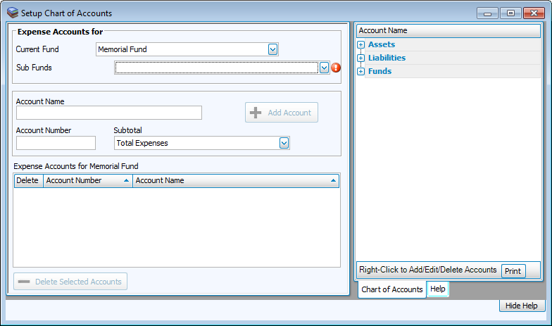 Expense account. If you choose to set up a Sub Fund for any Main Fund in the list, the Wizard will then allow you to add at least one Income account and/or at least one Expense account to each Sub Fund.