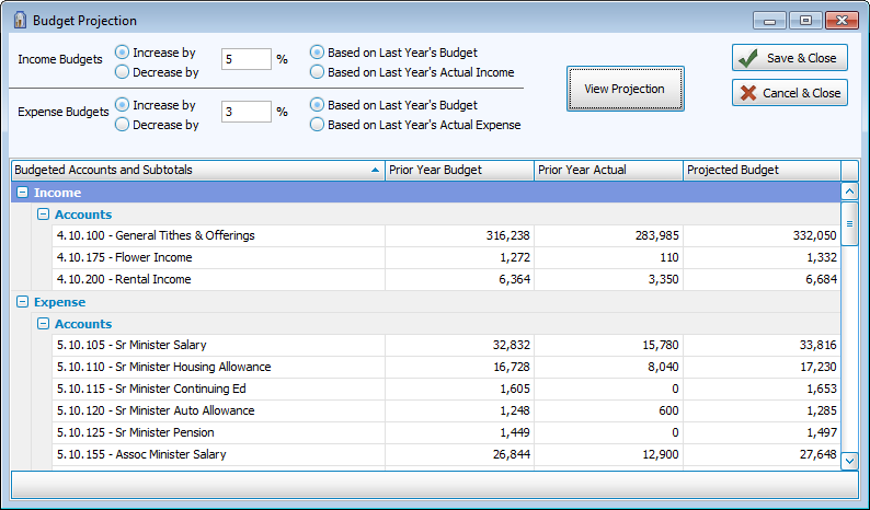 The Accounting module offers two ways to view and adjust budgets. You can use the Budgets screen to manually enter a budget amount for the desired accounts or you can use Budget Projections to adjust the current budget based on a percentage of either the prior year's actual income or budget amounts.