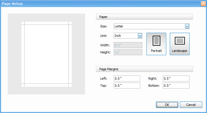 Click Page Setup to adjust paper size, page orientation, and margins.